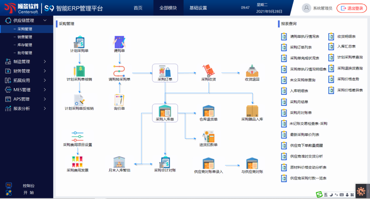 采购在接收到PMC请购需求时,可以把对应客户要求,关联至采购订单,并且采购明细有厚度、宽度、收卷长度、生产要求栏位指定,方便采购与计划以及销售的信息协同,仓库入库时多单位计量,系统不仅记录基本采购单位,还显示物料单重以及入库总重量。
